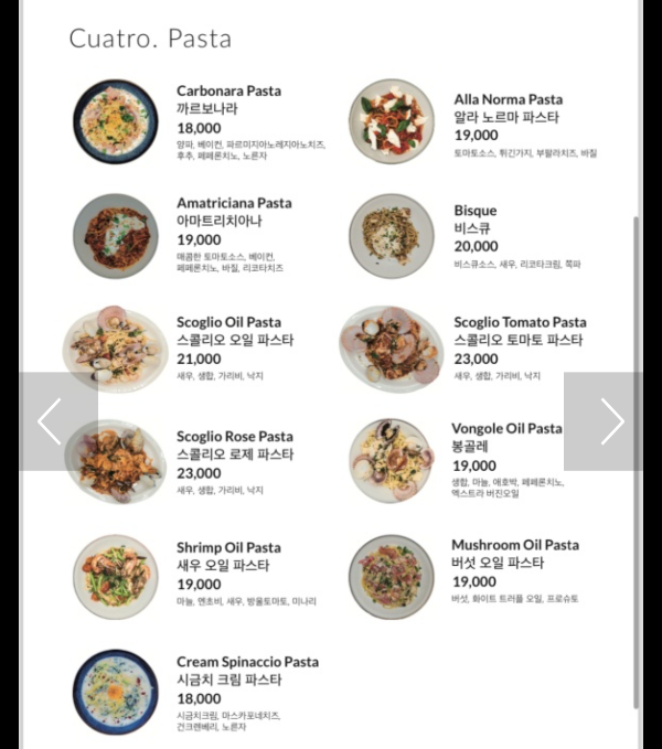 저희는 마스카포네, 마르게리타, 스콜리오로제파스타, 그리고 왜 메뉴에 안보이지?? 고등어 파스타(?) 를 먹었습니다.