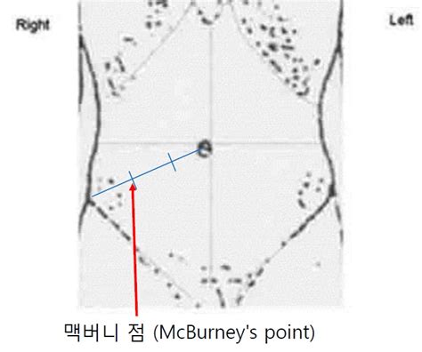이곳을 맥버니점(McBurney's point)이라고 하며, 급성충수염일 때 이 부위를 눌렀다가 뗄 때 심한 통증을 느끼게 됩니다.
