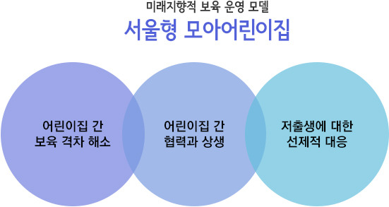 서울형 모아어린이집이란 인근 어린이집 간의 프로그램과 공간 등을 공유하며 보육의 질을 향상하고, 입소 대기를 공동으로 조정하여 운영의 효율성을 도모함으로써 어린이집이 서로 상생하고 양육자와 아동에게 도움이 되는 미래 지향적인 보육 모델입니다.