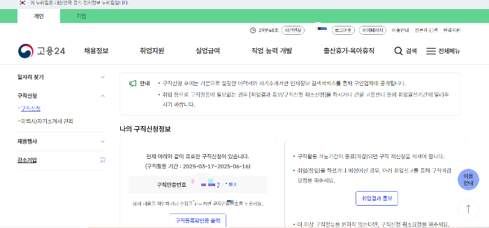 그럼 위와 같이 구직신청정보가 나옵니다.