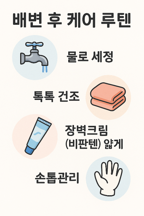 1. 닦는 법 바꾸기 :대변 후 미지근한 물로 부드럽게 씻기(향/알코올 있는 물티슈·비누 피하기), 톡톡 눌러 말리기.