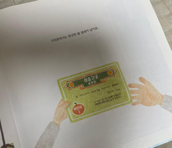 미나는 차장님에게 귤 한 개와 기차표를 내밀고 기차에 올라탑니다.
