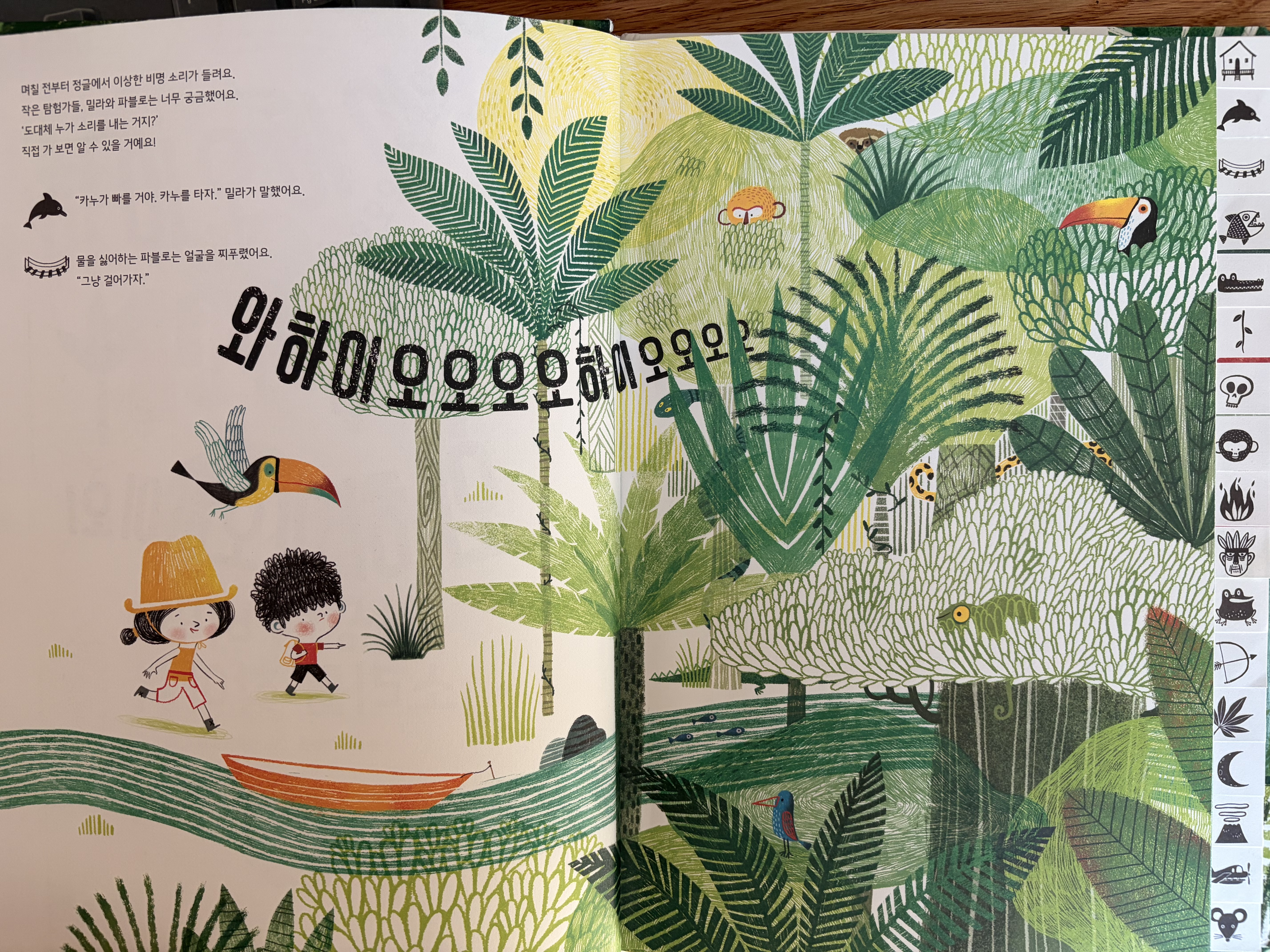 책 내용은 정글에서 들리는 이상한 비명 소리의 주인을 찾아 나서는 두 꼬마 탐험가 밀라와 파블로의 이야기에요.