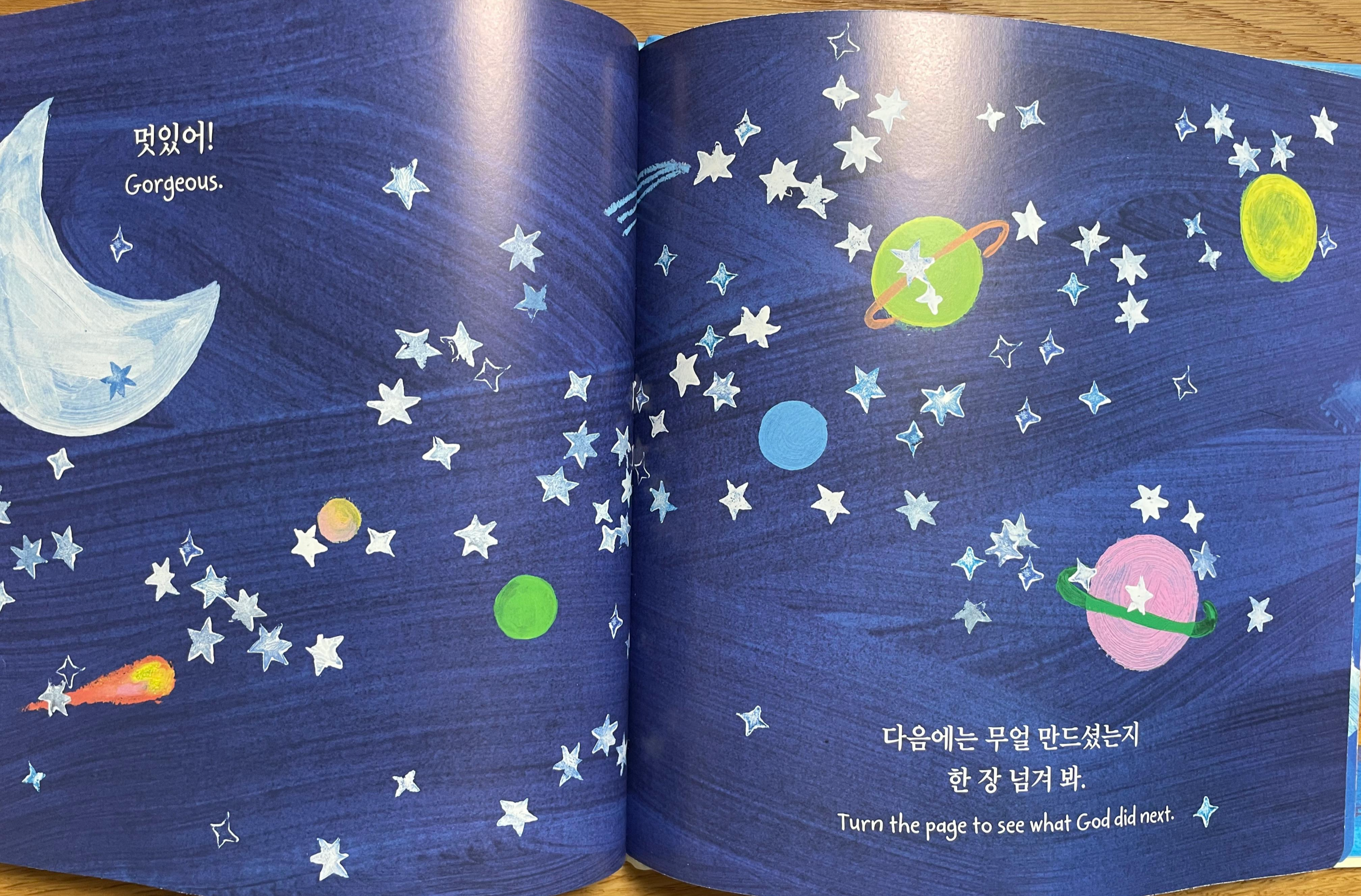 이 그림책은 창세기의 천지창조 이야기를 아이들이 손으로 흔들고, 입으로 불고, 손가락으로 두드리며 따라 할 수 있도록 구성되어 있습니다. 예를 들어, 페이지를 문지르면 빛과 어둠이 나타나는 등, 각 창조의 날에 해당하는 활동을 통해 아이들이 자연스럽게 창조의 과정을 체험할 수 있습니다. 이러한 상호작용은 아이들의 상상력과 문해력을 키우는 데 도움을 줍니다.